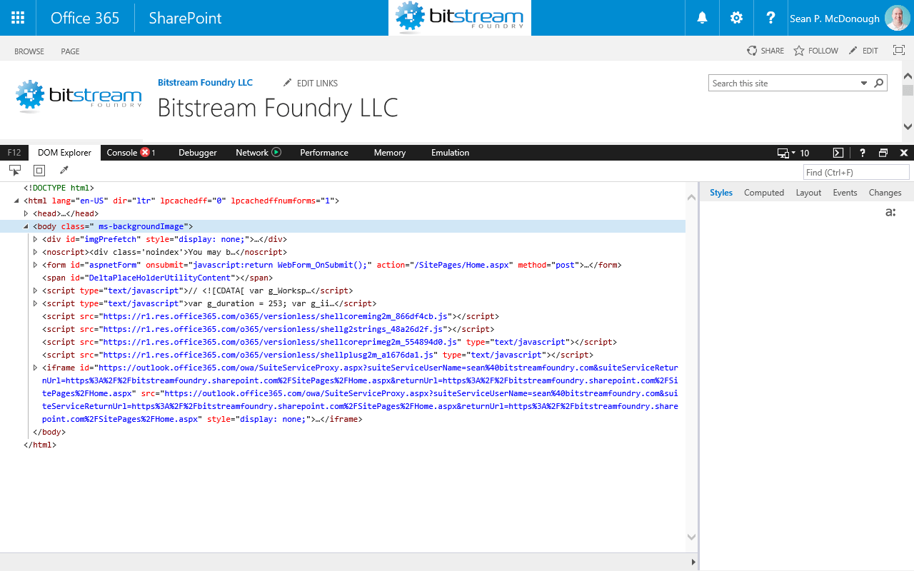 I start by opening Internet Explorer and navigating to the Bitstream Foundry intranet home page at https://bitstreamfoundry.sharepoint.com. Once I move past the sign-in prompts, Iām shown my home page: