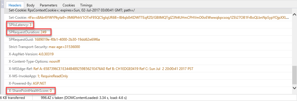 X-SharePointHealthScore. This is the value, from zero to ten, that indicates how heavily loaded the SharePoint Server is at the time when the page was served. A score of zero means the server is not under load, while a score of ten means the server is overloaded. As theĀ X-SharePointHealthScore goes up, the server begins to selectively suspend work designated as ālow priority,ā like some Timer Service jobs, Search requests, and various other low-priority tasks. ideally, this value should be zero ā or close to it. In my example, the value is zero.
